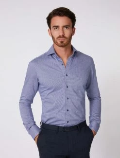 Opzoek naar een klassiek blauw overhemd met een subtiele ruit, dan is het Aidan overhemd echt iets voor jou. Het Aidan overhemd heeft een slim fit pasvorm en een widespread kraag. Dit overhemd is gemaakt van een jersey kwaliteit waardoor het overhemd zacht en comfortabel aanvoelt. De subtiele ruitprint en contrasterende knopen zorgen ervoor dat dit overhemd net even anders is. Combineer dit overhemd eindeloos met een pullover of colbert om je look helemaal af te maken.