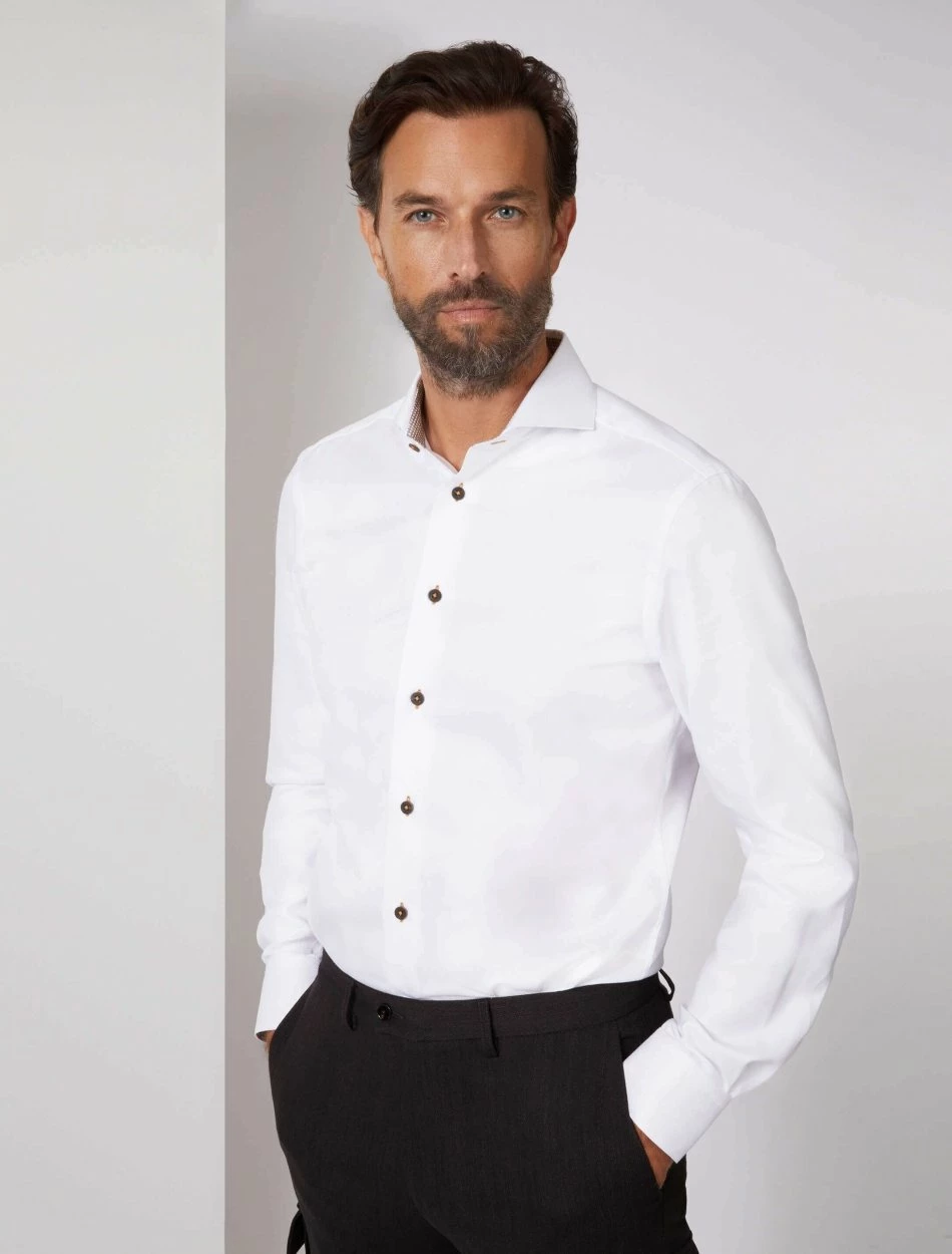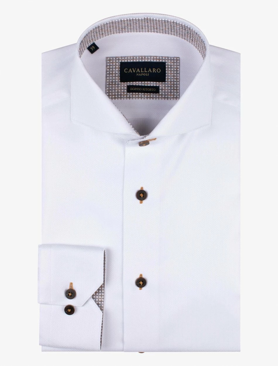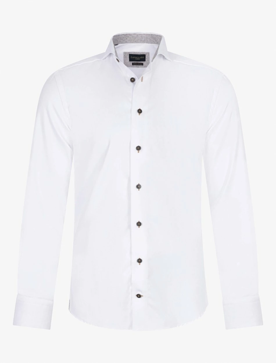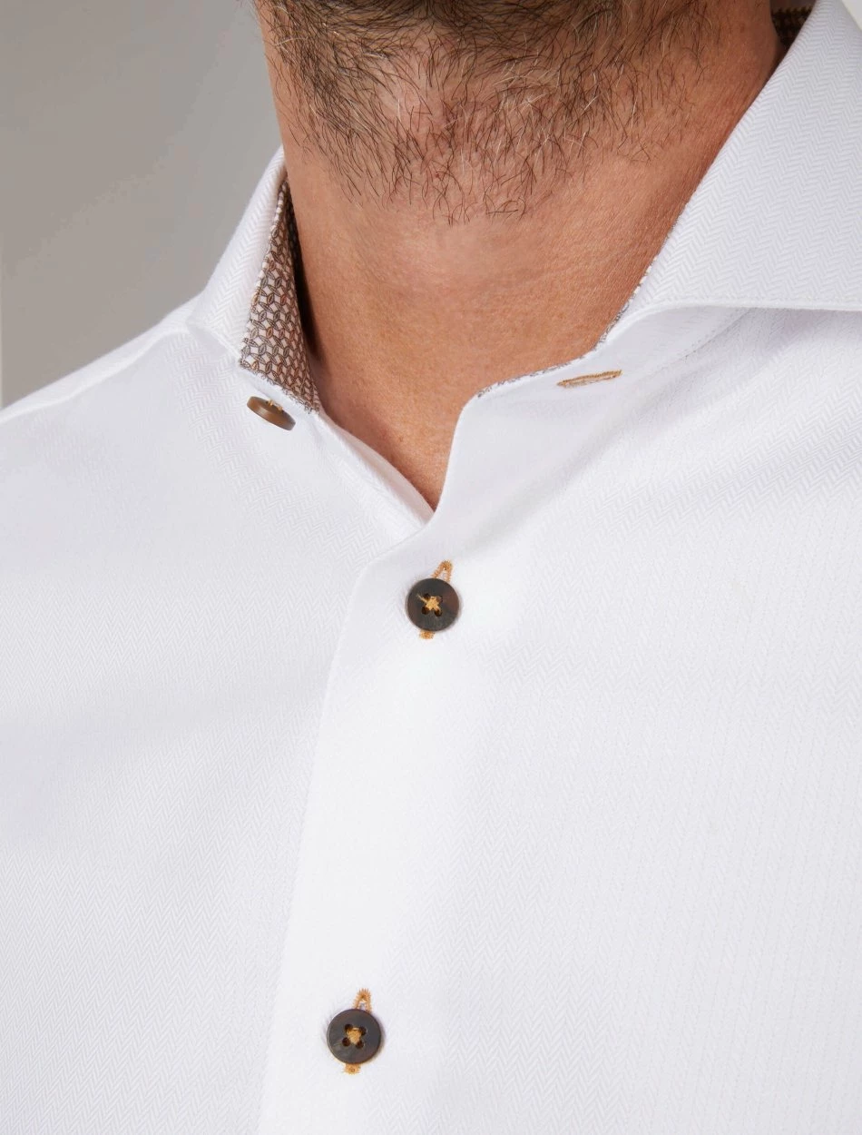 Ginaro overhemd is chique wit overhemd met een klassieke visgraatweving. Het Ginaro overhemd is gemaakt van 100% katoen en heeft een slim fit pasvorm. De binnenkant van de kraag en heeft een print en de knopen en stiksels hebben een contrasterende kleur, wat een speels effect geeft. Combineer het Ginaro overhemd met een pantalon en half zip pullover voor een complete look.