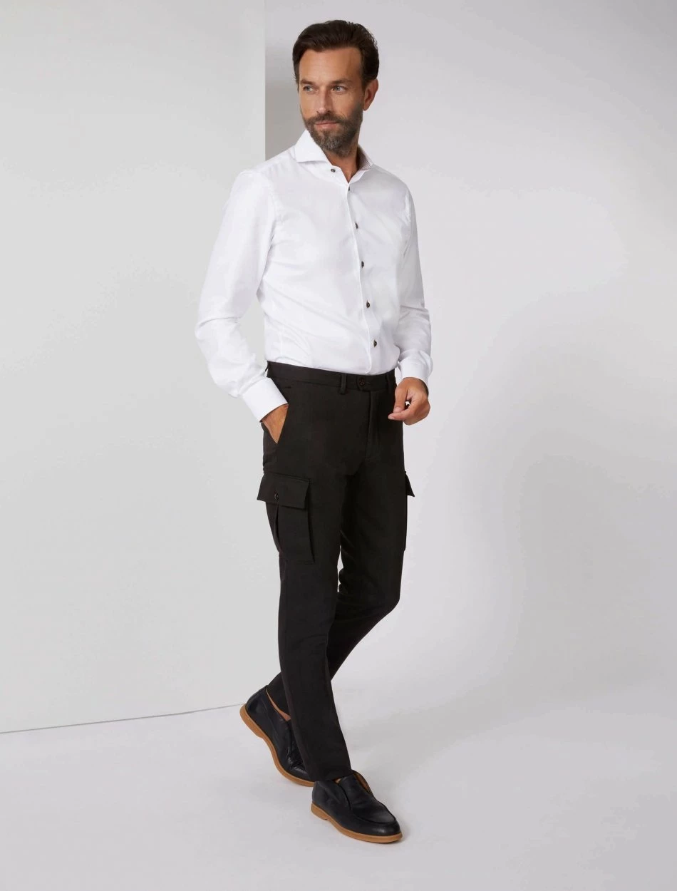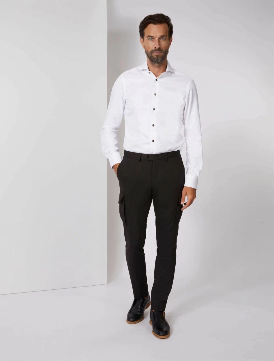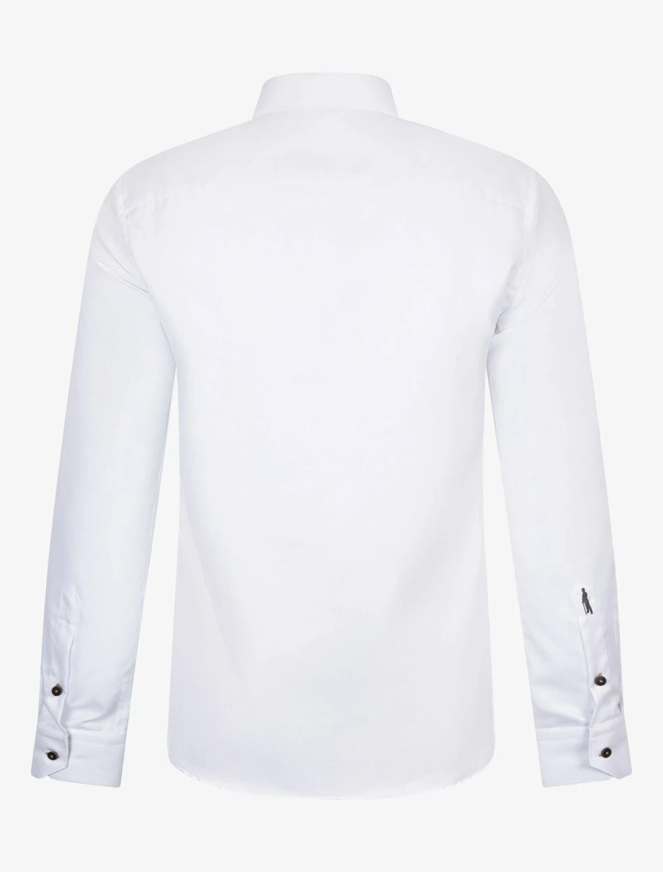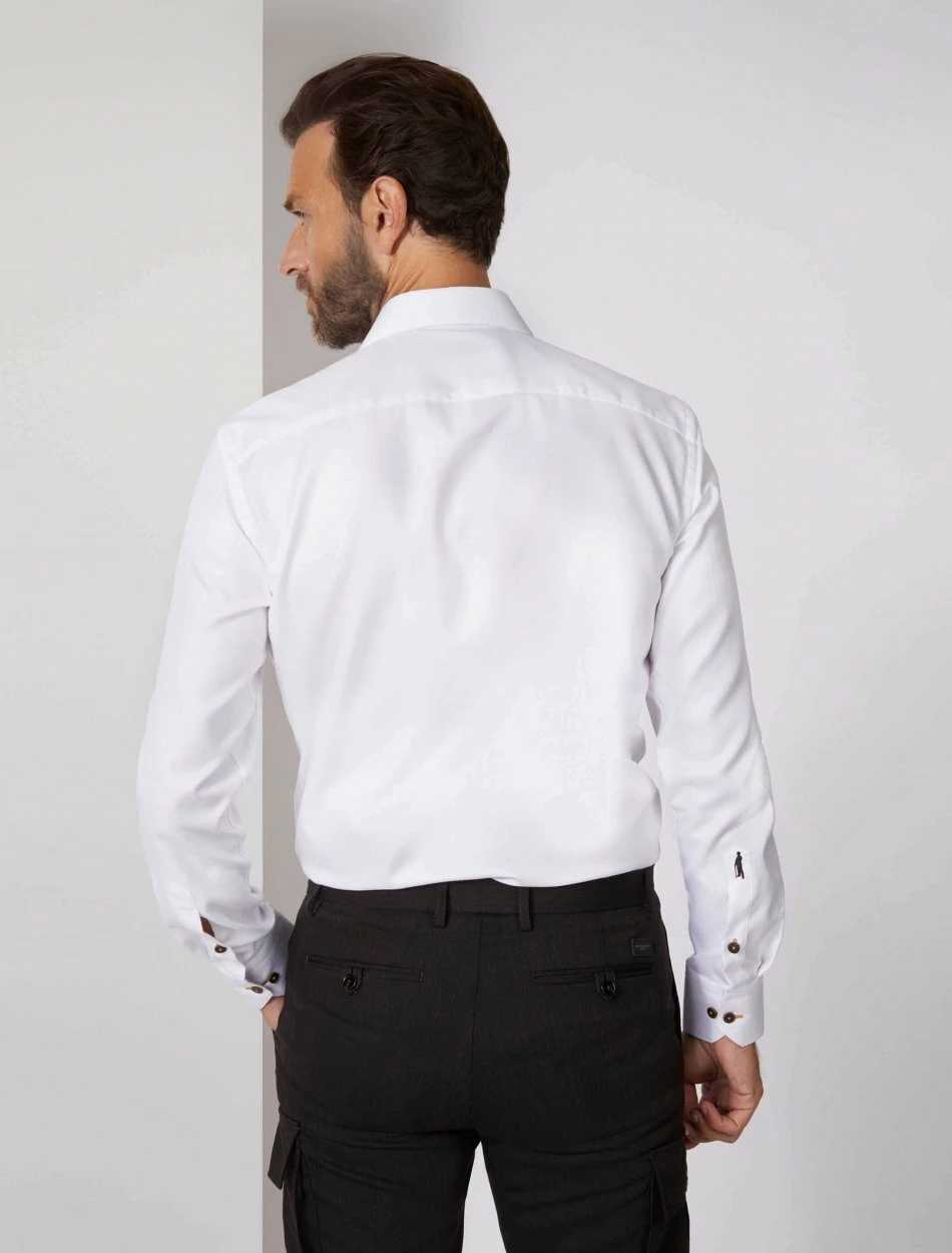 Ginaro overhemd is chique wit overhemd met een klassieke visgraatweving. Het Ginaro overhemd is gemaakt van 100% katoen en heeft een slim fit pasvorm. De binnenkant van de kraag en heeft een print en de knopen en stiksels hebben een contrasterende kleur, wat een speels effect geeft. Combineer het Ginaro overhemd met een pantalon en half zip pullover voor een complete look.