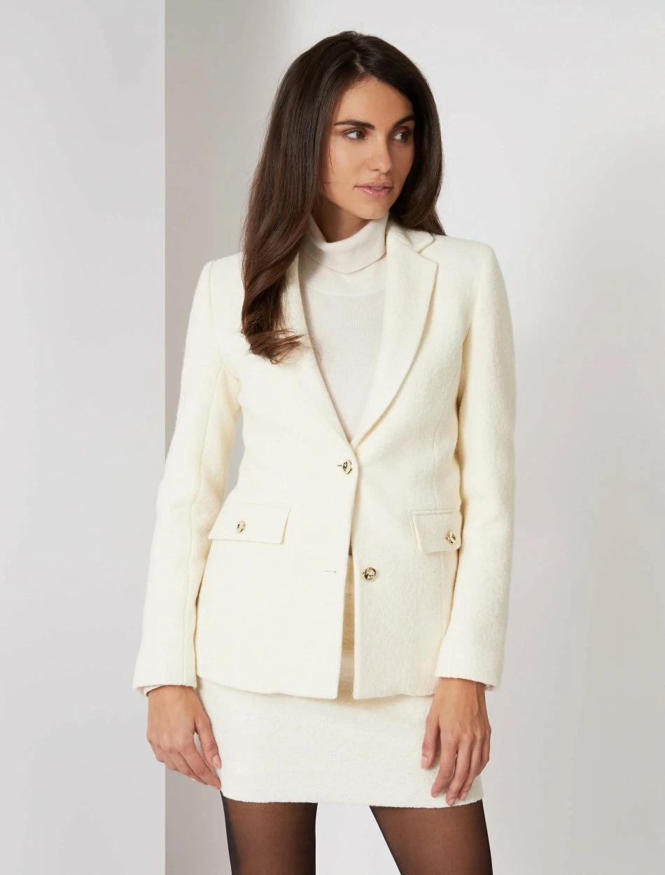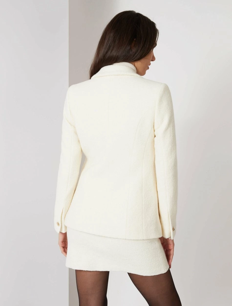 Jilliana blazer is de perfecte witte blazer voor dit najaar. Deze klassieke single breasted blazer van een bouclé materiaal is gemaakt van wol in combinatie met viscose. Jilliana blazer heeft klepzakken en heeft gouden knopen wat deze blazer een chique uitstraling geeft. Combineer de Jilliana blazer met de bijpassende Clarice rok voor een complete look.