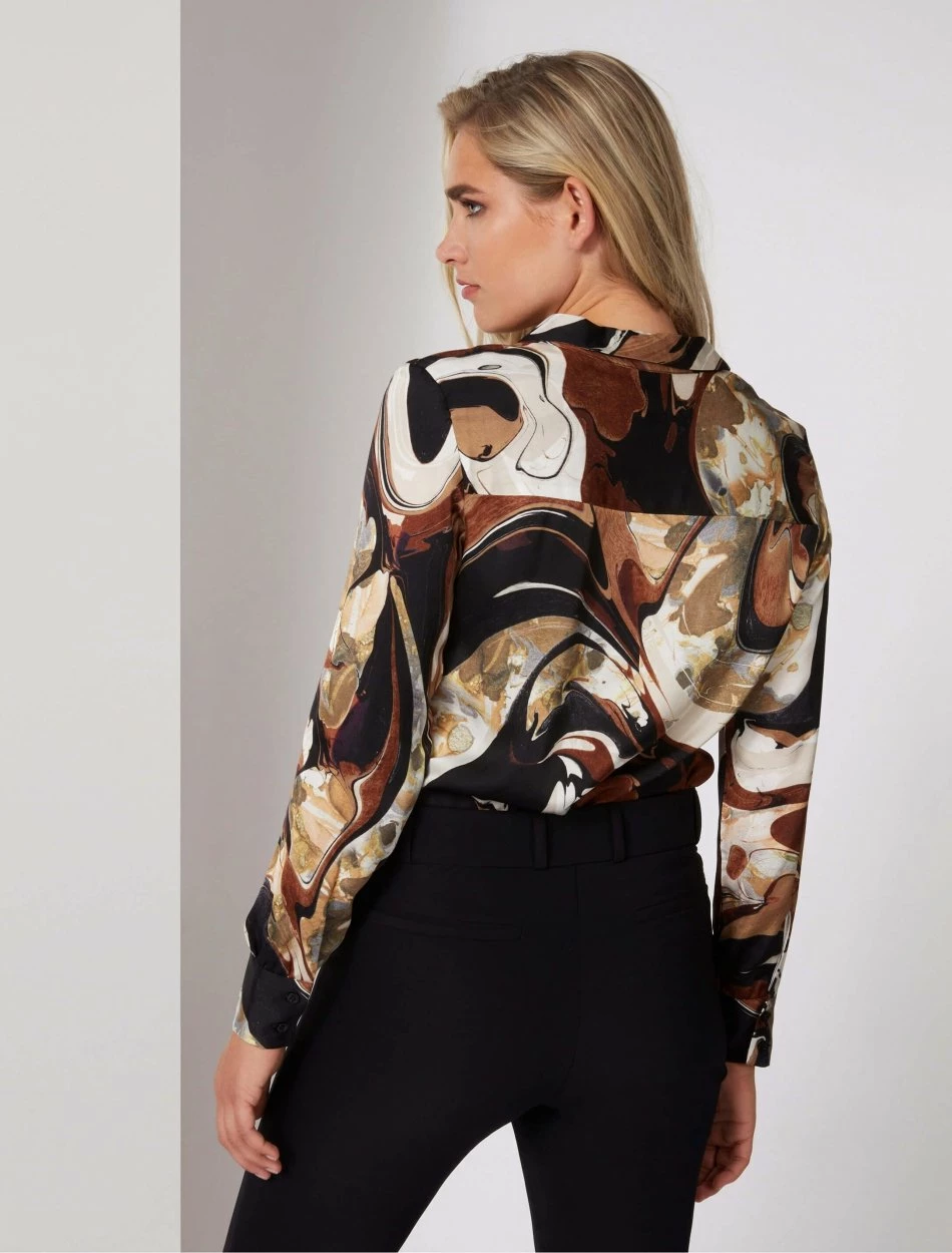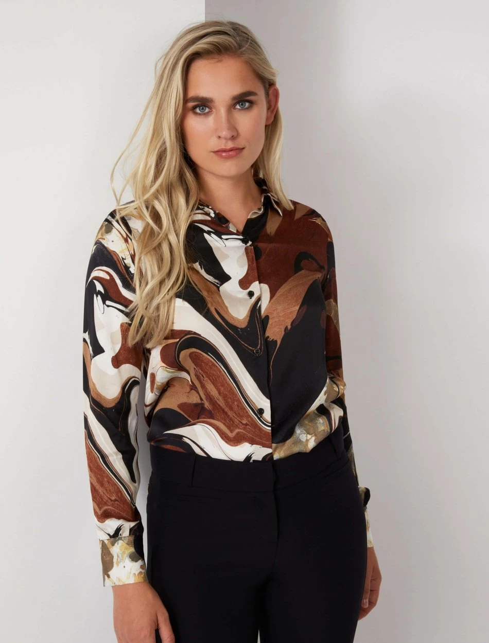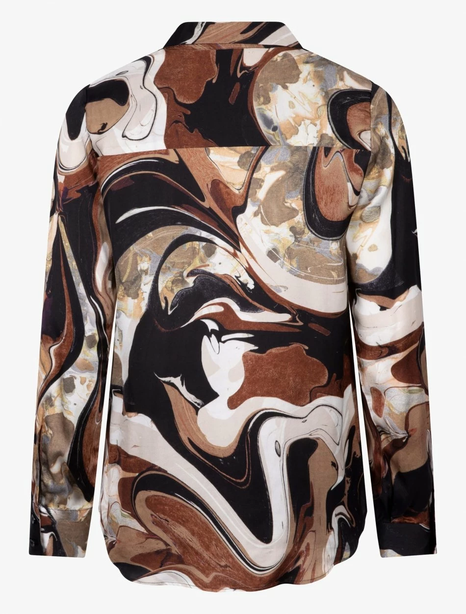 Marlina blouse heeft een uitgesproken overall marble print. De Marline blouse heeft een loose fit en is gemaakt van een 100% viscose. Viscose is kreukvrij en voelt luchtig aan. De achterkant van de blouse is iets langer waardoor de blouse zowel in als uit de pantalon kan worden gedragen. Combineer de Marlina blouse met een pantalon of rok voor een complete look. De Marlina blouse is verkrijgbaar in meerdere kleuren.
