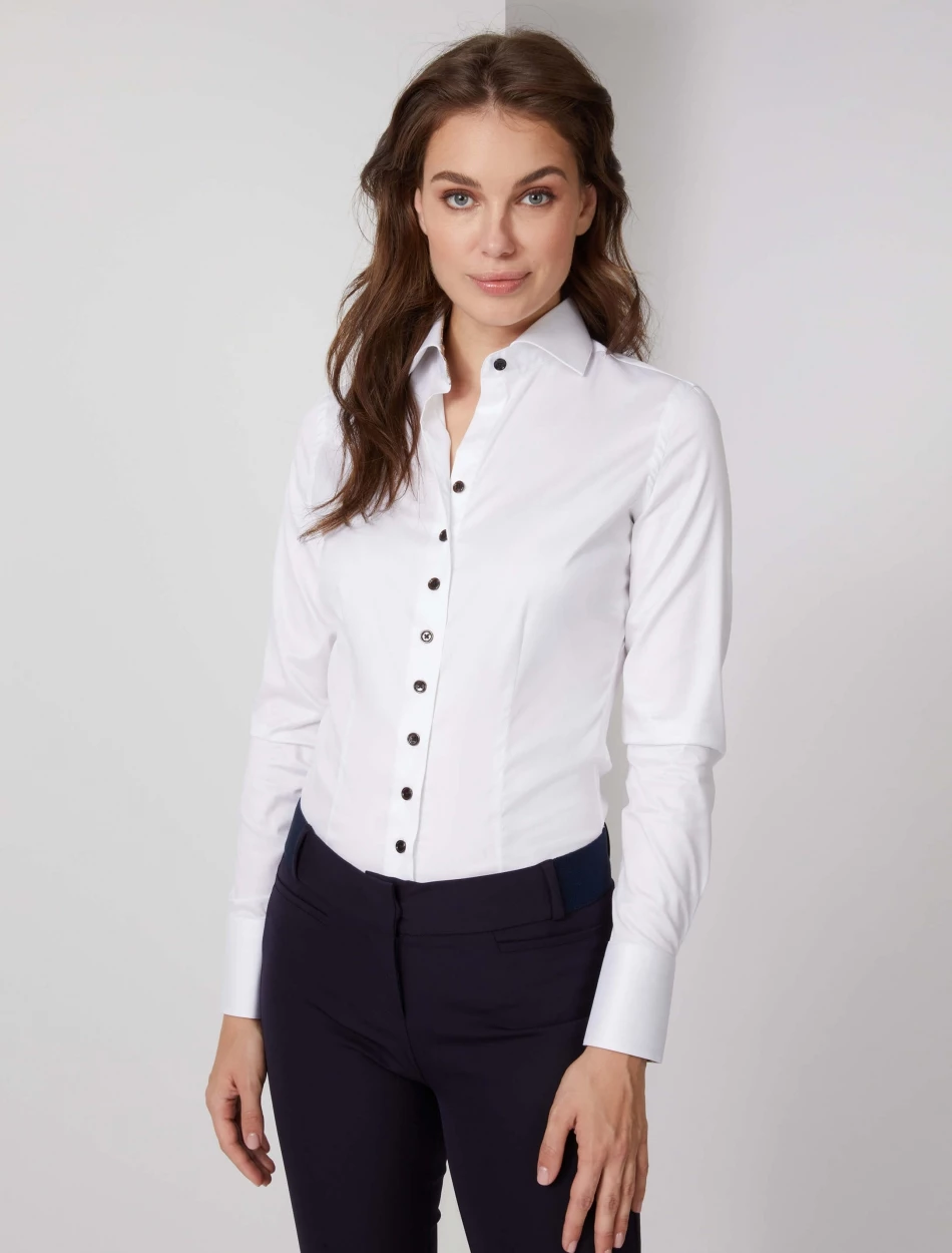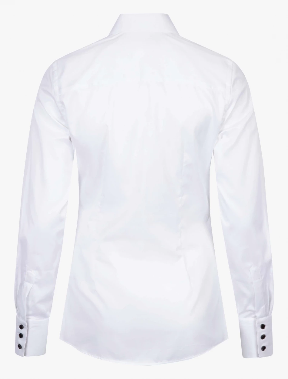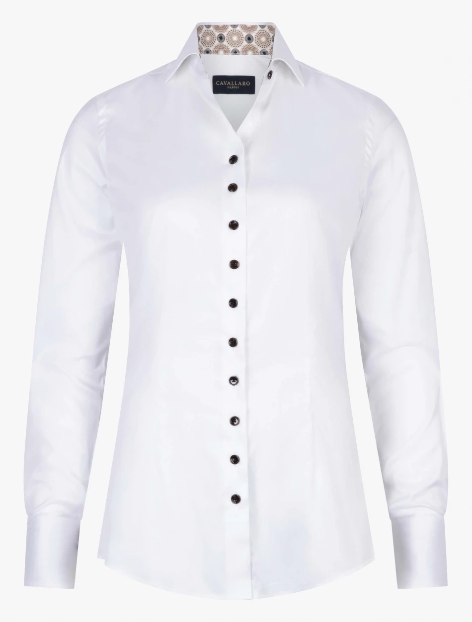 Monanizza blouse is een slim fit witte blouse met een klassieke kraag. De Monanizza blouse heeft bruine knopen en een print aan de binnenkant van de kraag en manchet. Deze blouse is gemaakt van een katoenblend met elastaan, wat zorgt voor extra veel stretch en een comfortabele fit. De Monanizza blouse is eindeloos te combineren met een pullover, blazer en pantalon voor een complete look.
