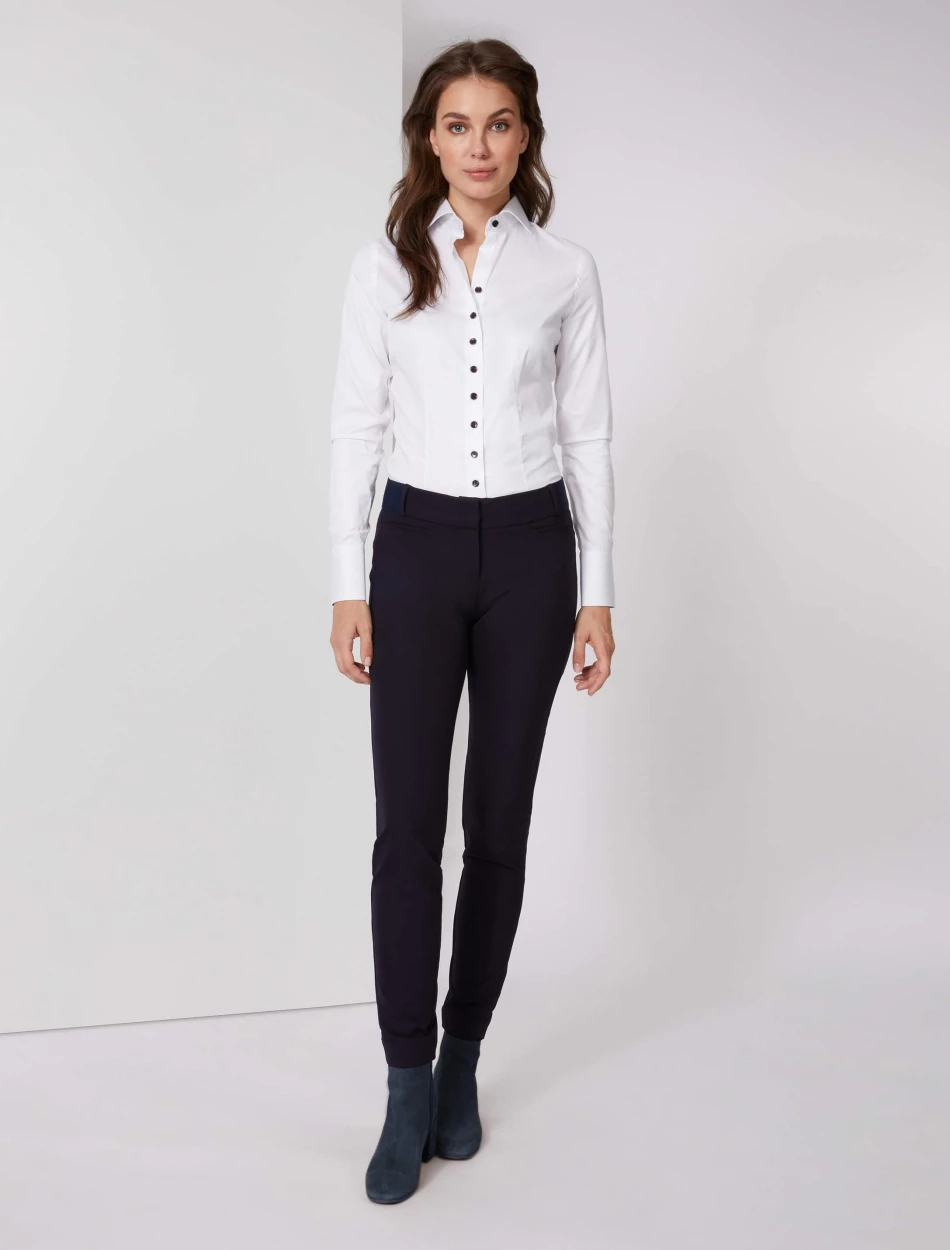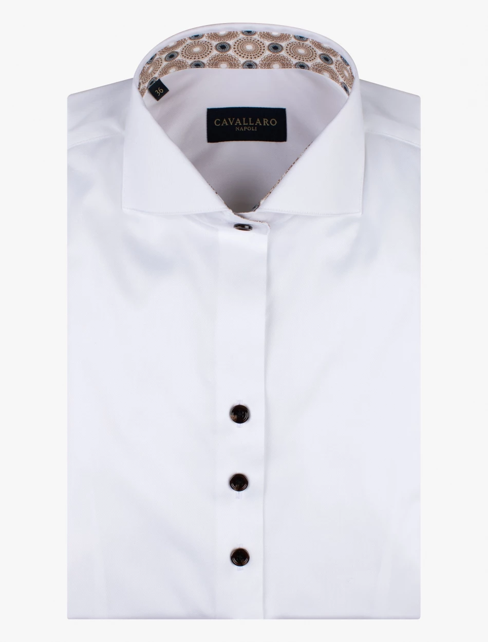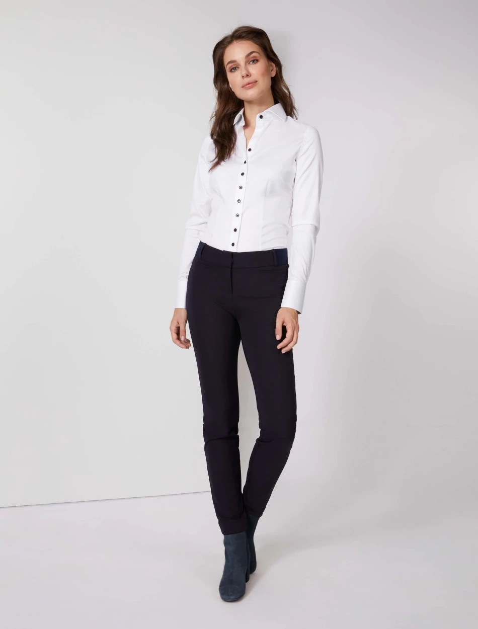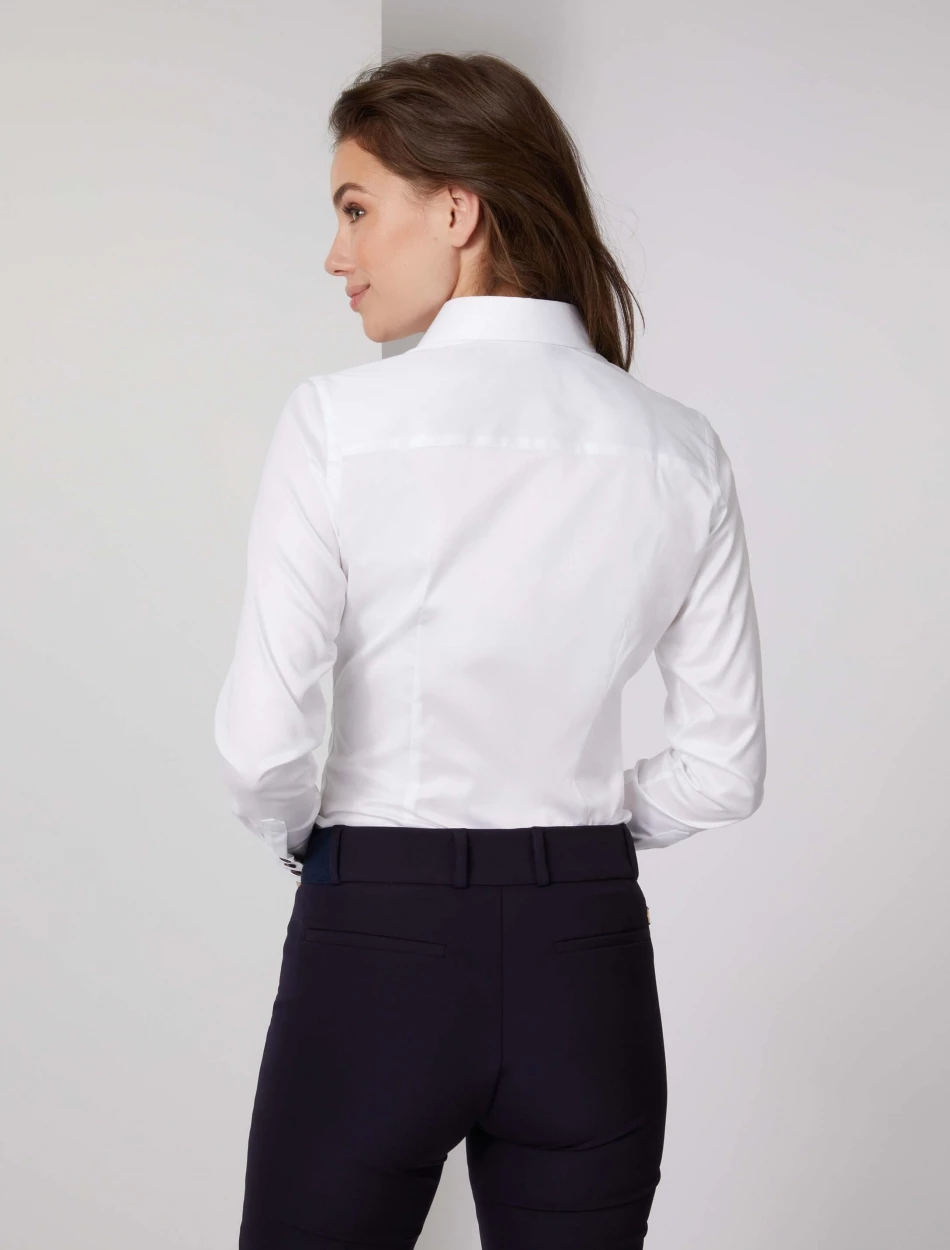 Monanizza blouse is een slim fit witte blouse met een klassieke kraag. De Monanizza blouse heeft bruine knopen en een print aan de binnenkant van de kraag en manchet. Deze blouse is gemaakt van een katoenblend met elastaan, wat zorgt voor extra veel stretch en een comfortabele fit. De Monanizza blouse is eindeloos te combineren met een pullover, blazer en pantalon voor een complete look.