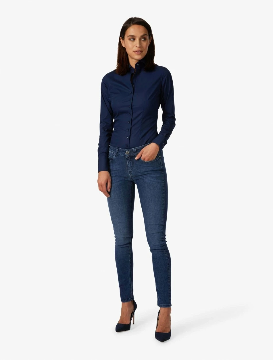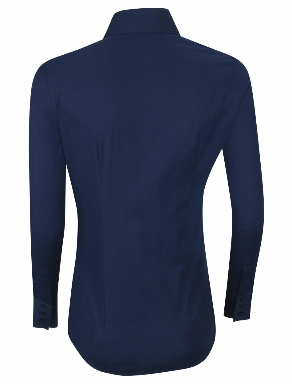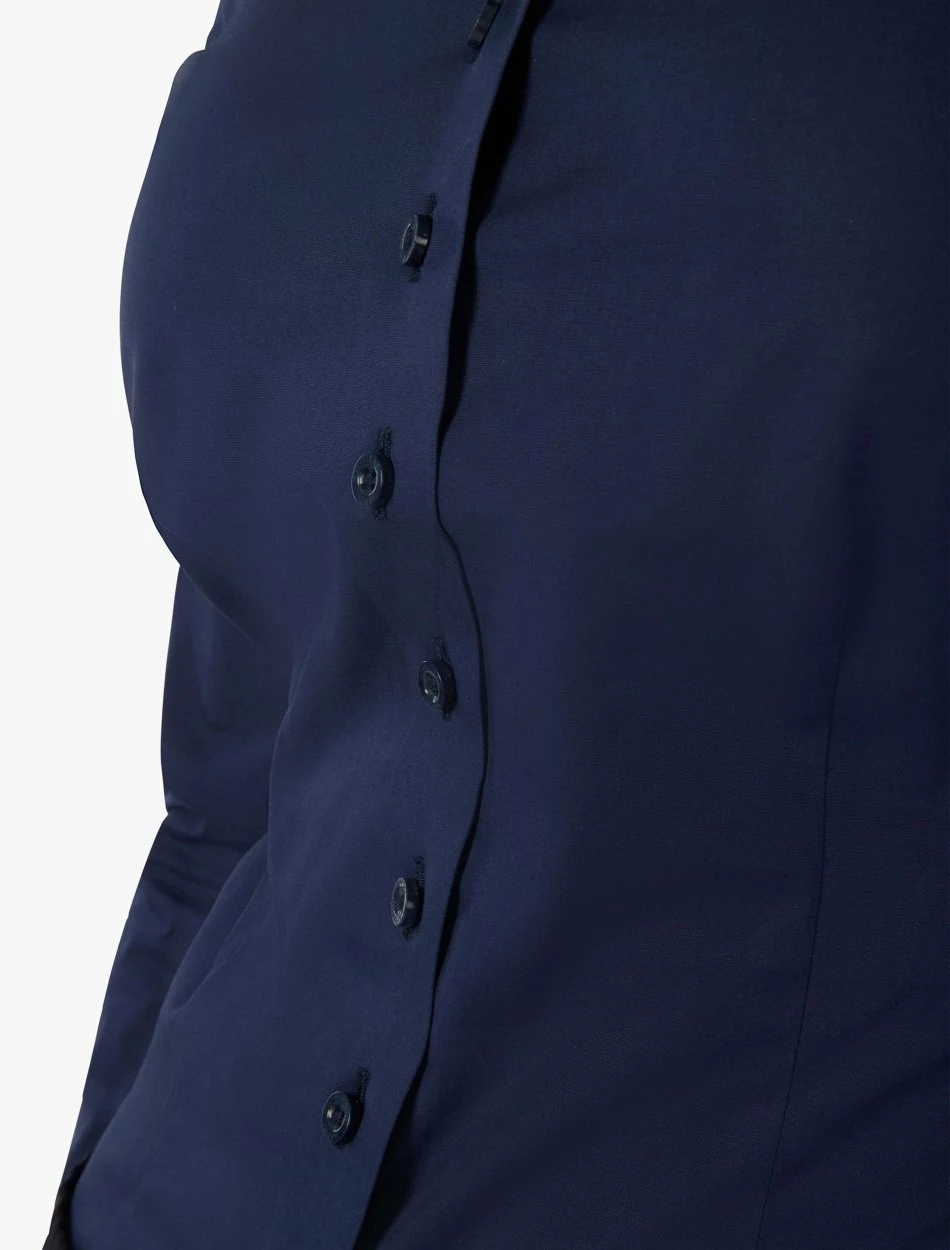 Navy NOS business blouse is de perfecte donkerblauwe slim fit  blouse die niet mag ontbreken in je garderobe. De Navy NOS blouse heeft een widespread kraag, extra knoopjes bij de borst en coupenaden wat ervoor zorgt dat de blouse voor iedereen een perfecte fit heeft. Combineer de Navy NOS blouse met een pantalon of jeans voor een complete look.