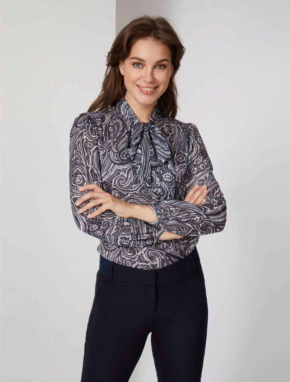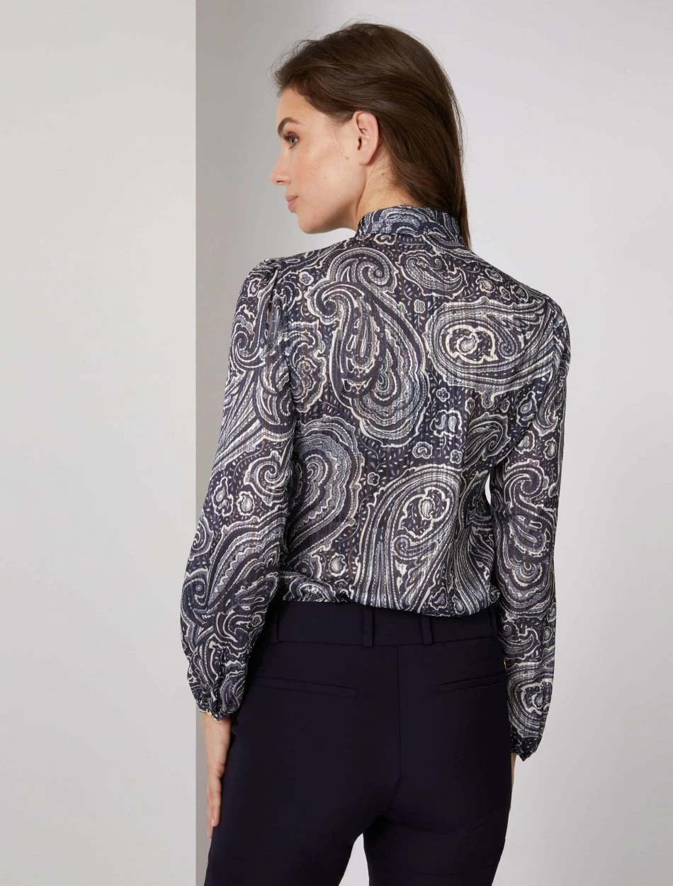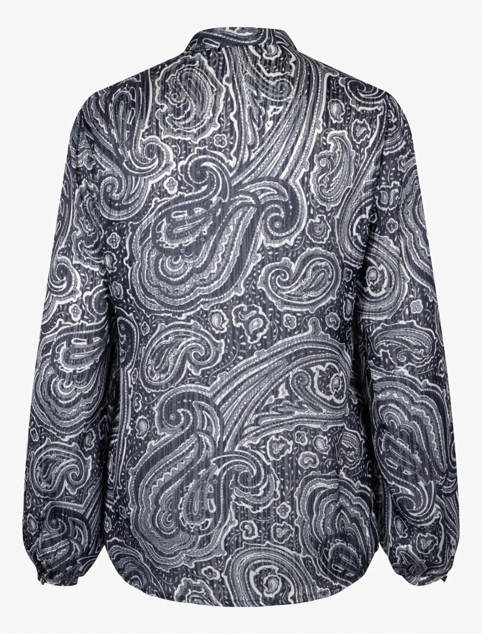 Noora blouse is een elegante dames blouse die gemakkelijk te combineren valt. De Noora-blouse heeft een overall paisley print en kan bij de hals worden gestrikt. Deze blouse heeft een regular fit en is gemaakt van 100% polyester. Combineer de Noora blouse met een chique pantalon voor een mooie zakelijke look. De Noora blouse is verkrijgbaar in twee kleuren. Let op: De blouse is transparant.