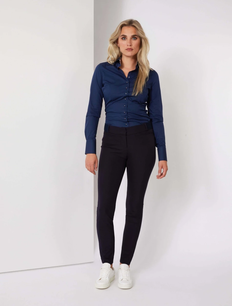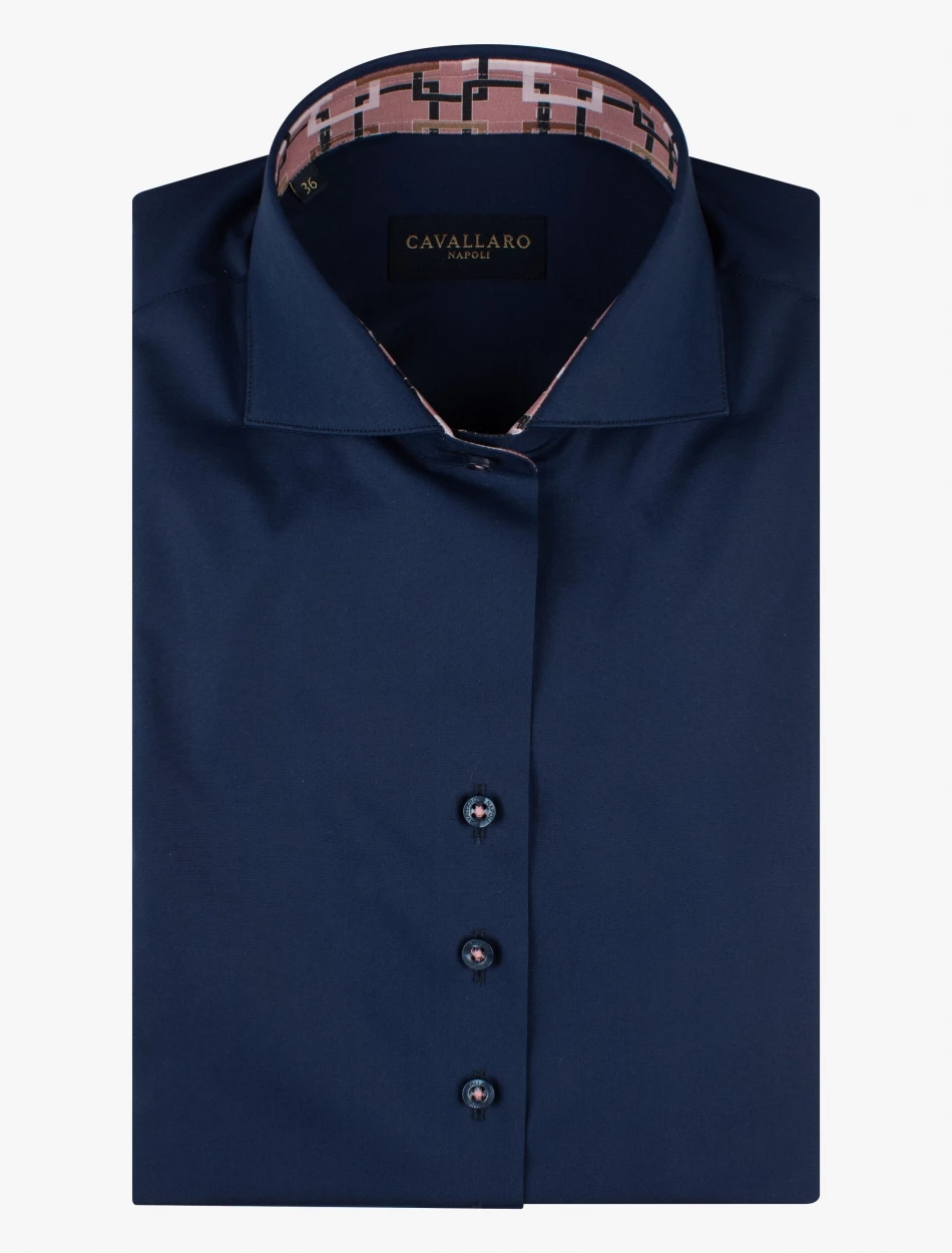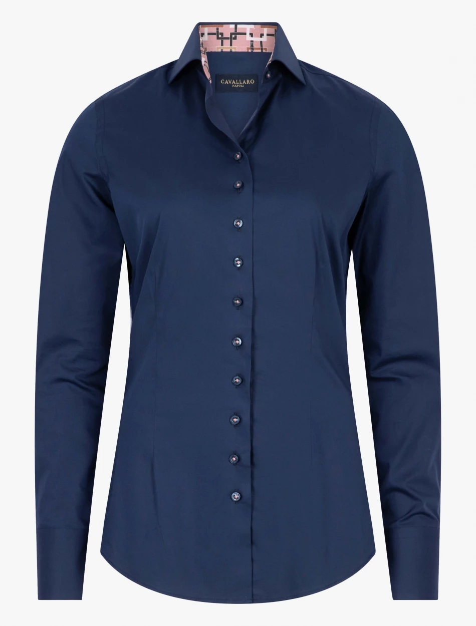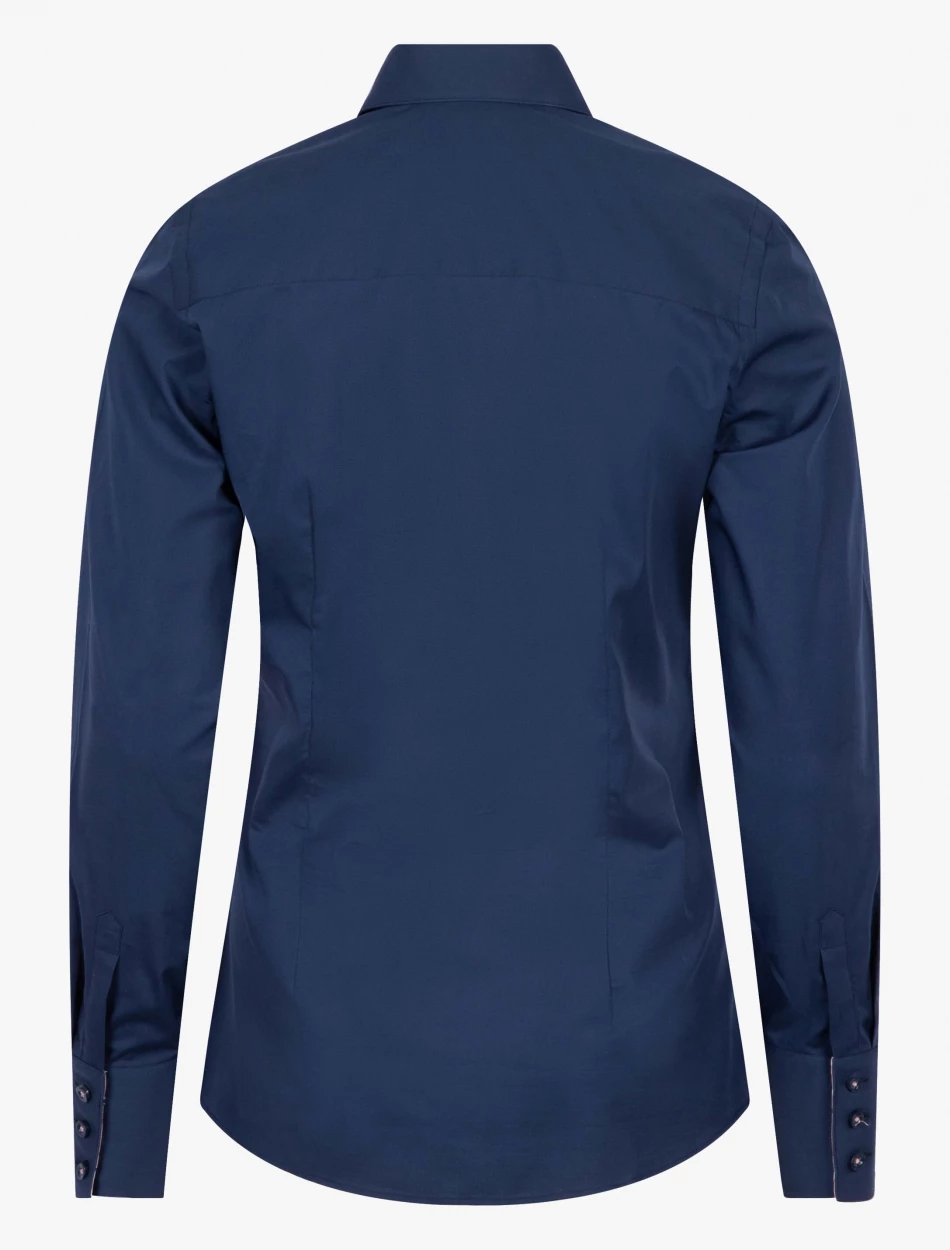 Velentina blouse is een donkerblauwe blouse met een slim fit pasvorm en gemaakt van een katoenblend kwaliteit. De stretch in de blouse zorgt ervoor dat deze blouse comfortabel zit en mooi aansluit. De binnenkant van de klassieke kraag en de manchetten zijn geprint. De roze stiksels geven deze blouse een extra twist. Combineer de Velentina blouse met een blazer, vest of pullover voor een complete look.
